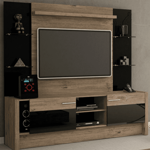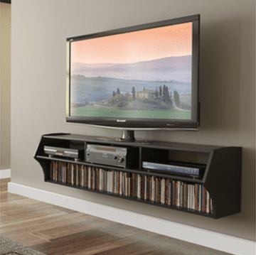 Perfect for the simple guy or gal, this unit shown above mounts cleanly above the floor and creates just enough space for your basic electronics and DVDs. Its stylish flair creates a look similar to a piano for a classic look and feel.
