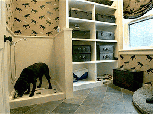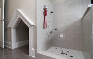 This pet washing station, which appears above, featured in the Pinehurst model by Standard Pacific in Austin, Texas, shows that bathing areas for pets can be stylish and functional. The walls are stylishly tiled and a showerhead makes it easy to clean pups in the hardest to reach places.