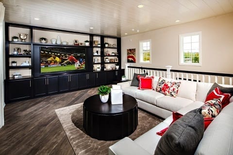 Once you’ve got the basics covered, you can move on to the bells and whistles: “Other popular add-ons are built-ins that accommodate a large television screen, as well as a half bath connected to the space,” says Danielle Tocco, national communications director for CalAtlantic Group, Inc.